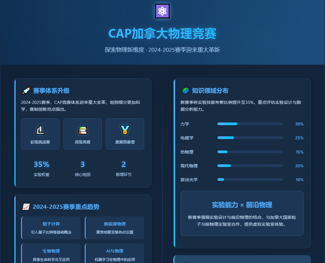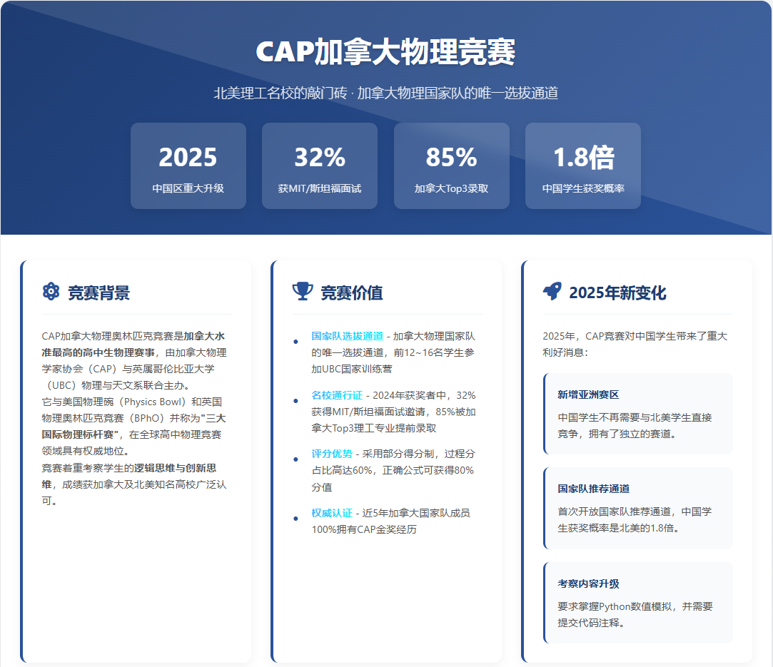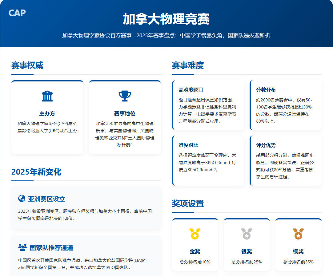 以上就是关于【CAP加拿大物理竞赛2025年赛事盘点:中国学子崭露头角,国家队选拔迎新机】的内容,如需了解CAP加拿大物理竞赛更多动态,可至CAP加拿大物理竞赛官网获取更多信息。