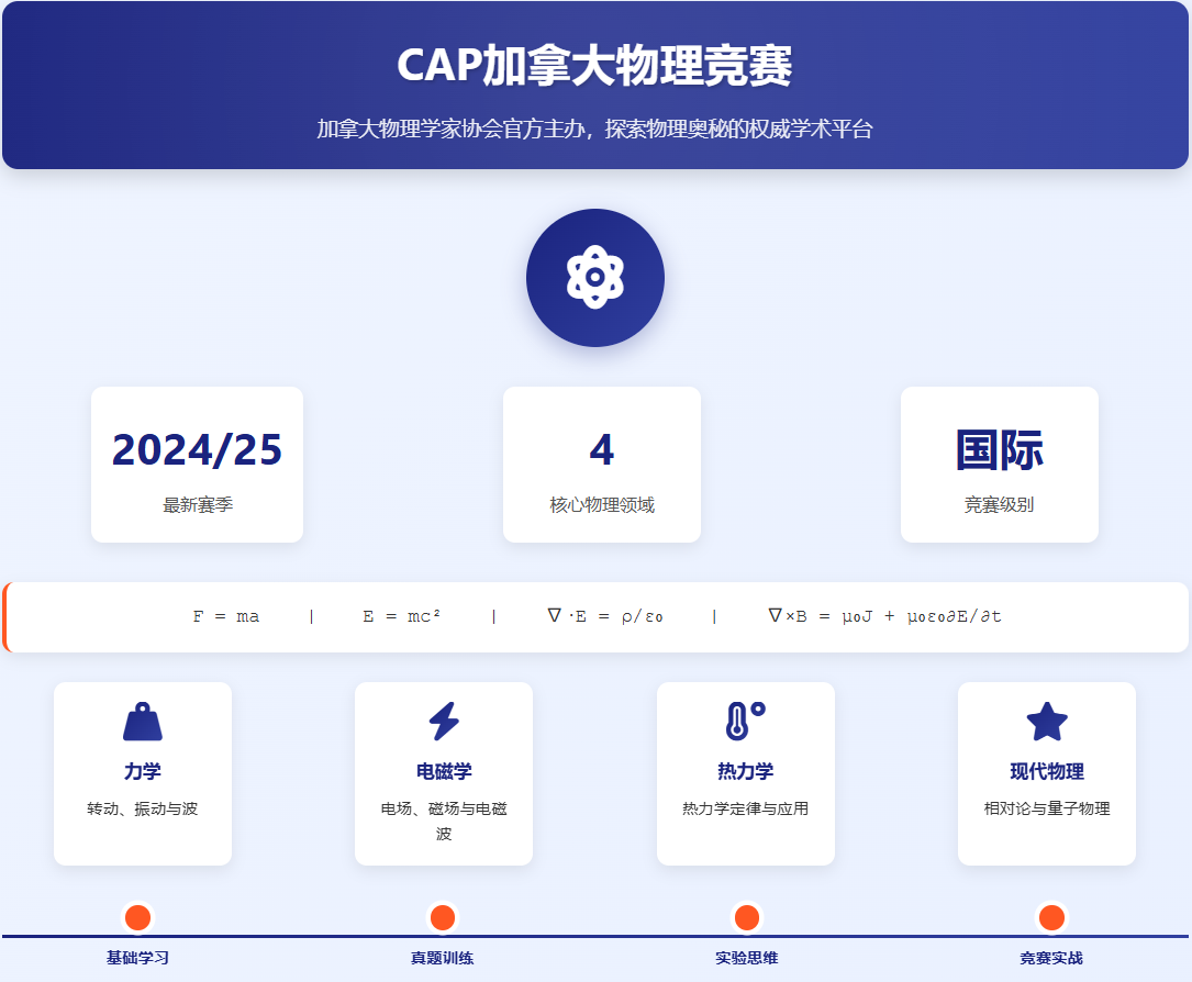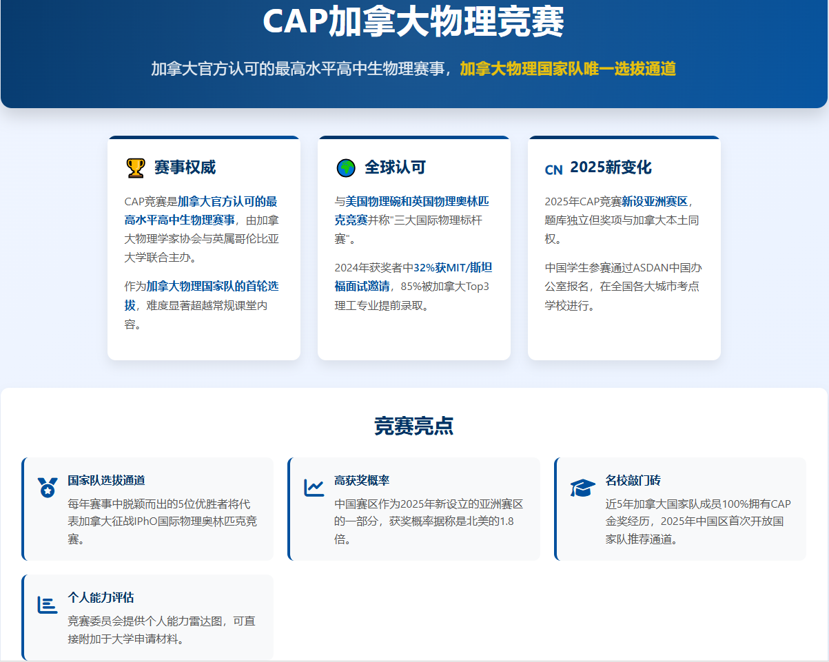 以上就是关于【探索物理新维度:CAP加拿大物理竞赛最新动态与参赛指南】的内容,如需了解CAP加拿大物理竞赛更多动态,可至CAP加拿大物理竞赛官网获取更多信息。