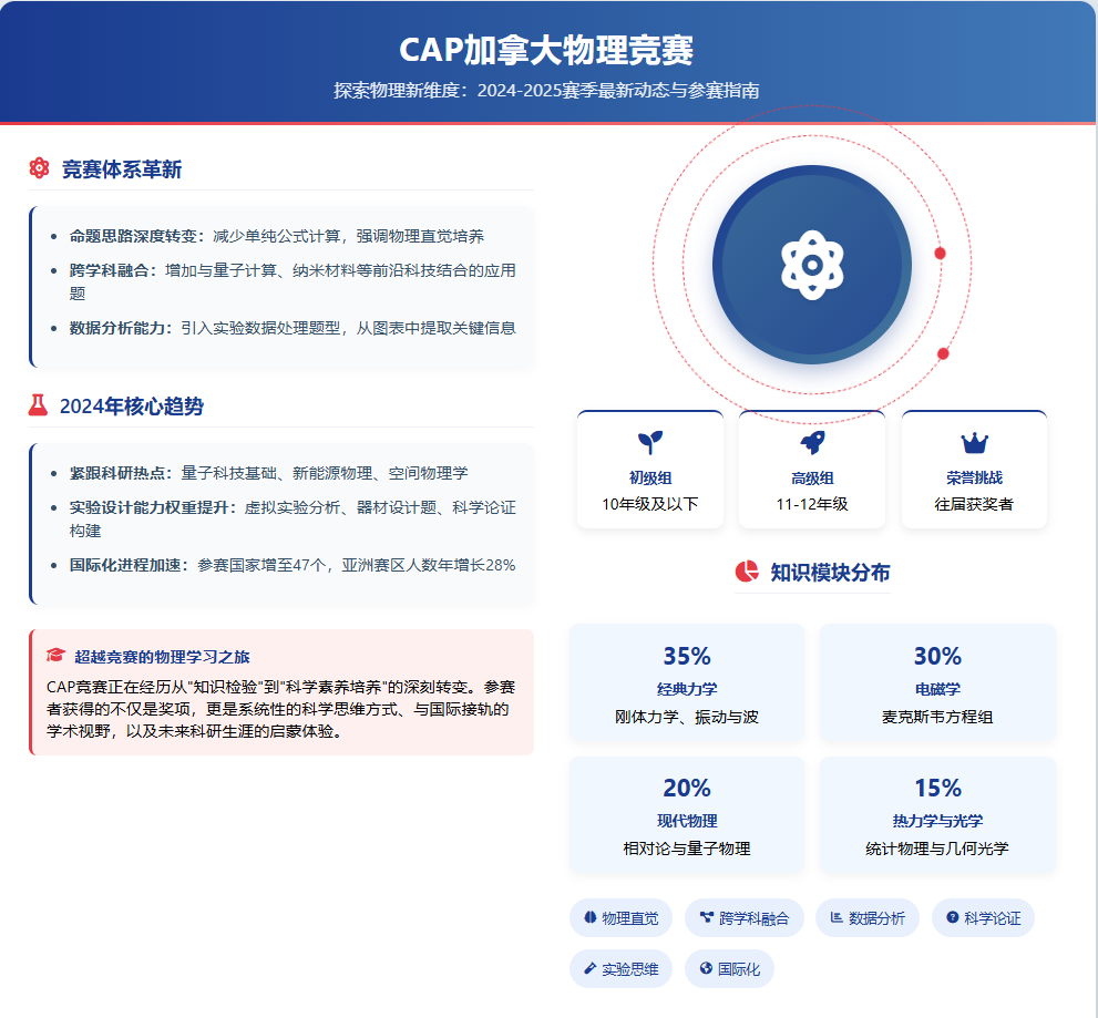 在北美地区享有盛誉的CAP加拿大物理竞赛(CAP High School Prize Exam)正以其独特的学术挑战性和前瞻性的命题思路,成为全球物理爱好者展现才华的重要舞台。随着2024-2025赛季的开启,这项由加拿大物理学会主办的竞赛呈现出令人瞩目的新趋势。
