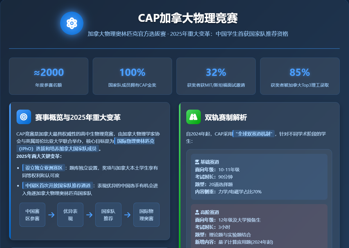 以上就是关于【加拿大物理竞赛(CAP)2025年赛事变革:竞赛规则全面升级,中国学生参赛路径拓宽】的内容,如需了解CAP加拿大物理竞赛更多动态,可至CAP加拿大物理竞赛官网获取更多信息。
