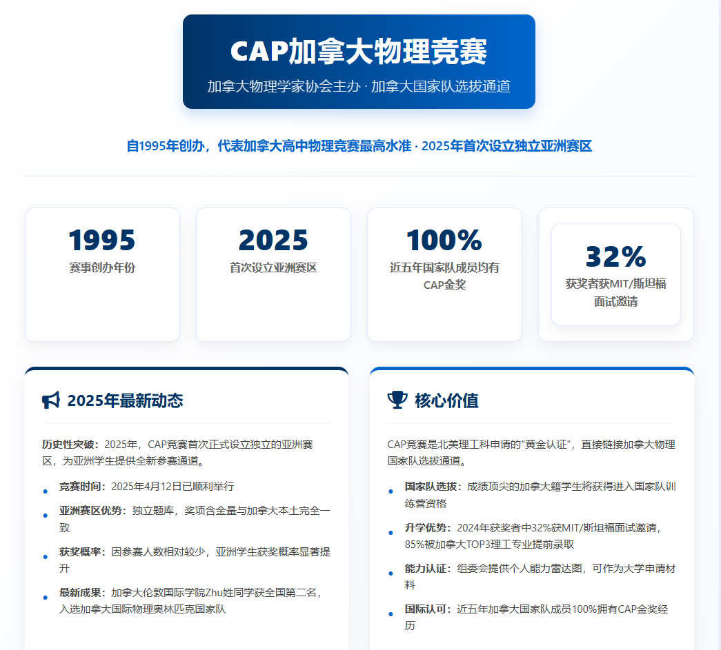 以上就是关于【CAP物理竞赛:加拿大国家队跳板,2025年亚洲赛道迎历史性机遇】的内容,如需了解CAP加拿大物理竞赛更多动态,可至CAP加拿大物理竞赛官网获取更多信息。