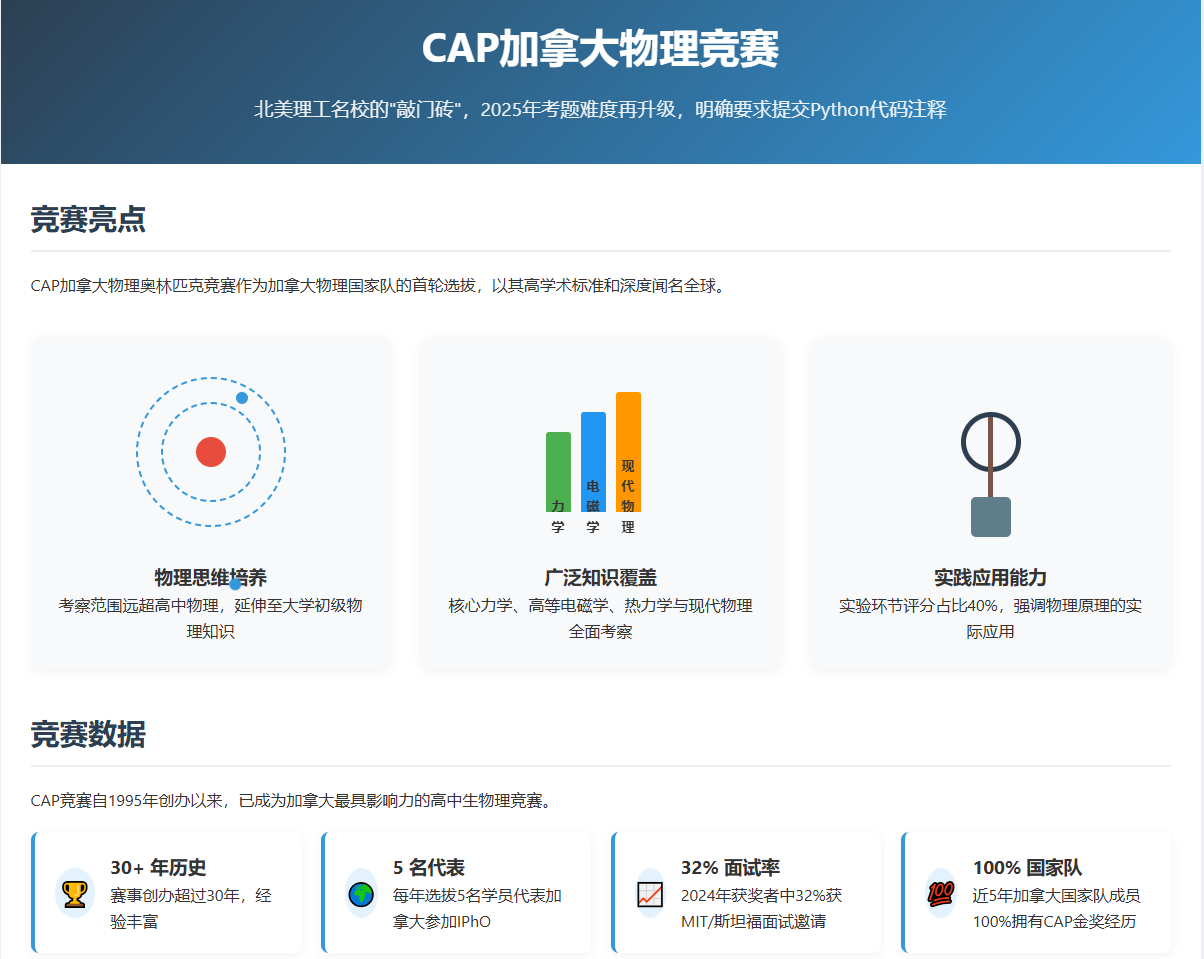 2025年,CAP加拿大物理奥林匹克竞赛(CAP Prize Exam)迎来重大变革——首次为中国选手专门开辟了国家队推荐通道。这一消息已得到中国赛区官方合作机构的确认。