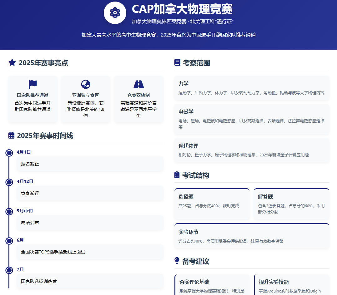 加拿大物理奥林匹克竞赛(CAP)作为加拿大官方物理国家队选拔赛,每年吸引着全球众多物理精英学子参与。2025年CAP竞赛已正式启动,新赛季不仅延续了高标准的学术挑战,更为中国赛区学生带来了多项利好。